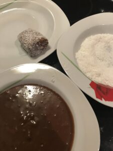 - Con la ayuda de dos tenedores ves mojando las barritas en cobertura y a continuación pásalas por virutas de coco
